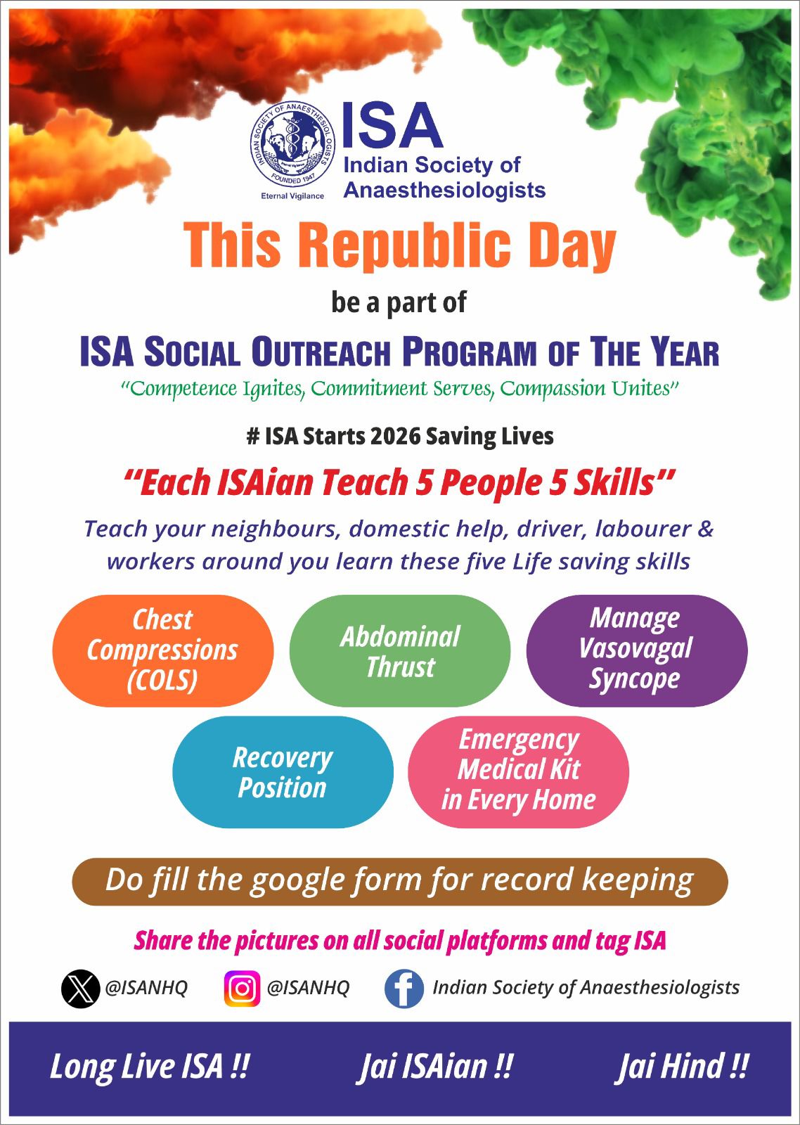 Let's join together on this Republic Day to teach 5 lay persons (neighbours, domestic help, driver) 5 life saving skills: Chest Compressions (COLS), Recovery Position, Abdominal Thrusts, Leg raise in vasovagal syncope, emergency medicine kit (details attached).